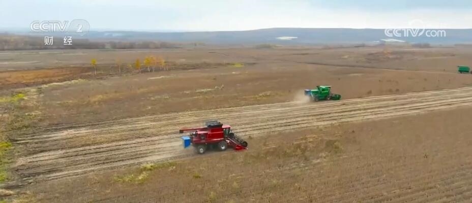 在黑河市遜克縣干岔子鄉(xiāng)的大豆收獲現(xiàn)場,金燦燦的大豆種植田連綿成片,三臺大型收割機在田間來往縱橫,井然有序。伴隨著機器的轟鳴聲,收割機將大豆收割、脫粒,然后依次轉(zhuǎn)到旁邊等候的運輸車運走。在收獲大豆的同時開展秋整地工作,兩臺大型拖拉機牽引著深松機,把收割完的土地進行深翻,改善耕地質(zhì)量。