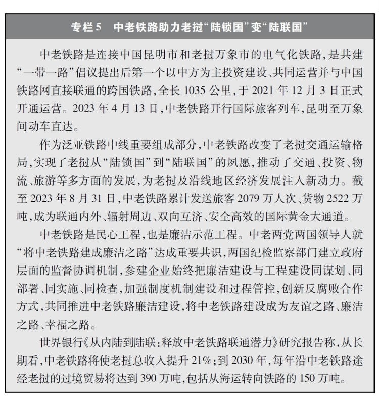 經濟走廊和國際通道建設卓有成效。共建國家共同推進國際骨干通道建設,打造連接亞洲各次區(qū)域以及亞歐非之間的基礎設施網絡。中巴經濟走廊方向,重點項目穩(wěn)步推進,白沙瓦-卡拉奇高速公路(蘇庫爾至木爾坦段)、喀喇昆侖公路二期(赫韋利揚-塔科特段)、拉合爾軌道交通橙線項目竣工通車,薩希瓦爾、卡西姆港、塔爾、胡布等電站保持安全穩(wěn)定運營,默拉直流輸電項目投入商業(yè)運營,卡洛特水電站并網發(fā)電,拉沙卡伊特別經濟區(qū)進入全面建設階段。新亞歐大陸橋經濟走廊方向,匈塞鐵路塞爾維亞貝爾格萊德-諾維薩德段于2022年3月開通運營,匈牙利布達佩斯-克萊比奧段啟動軌道鋪設工作;克羅地亞佩列沙茨跨海大橋迎來通車一周年;雙西公路全線貫通;黑山南北高速公路順利建成并投入運營。中國-中南半島經濟走廊方向,中老鐵路全線建成通車且運營成效良好,黃金運輸通道作用日益彰顯;作為中印尼共建“一帶一路”的旗艦項目,時速350公里的雅萬高鐵開通運行;中泰鐵路一期(曼谷-呵叻)簽署線上工程合同,土建工程已開工11個標段(其中1個標段已完工)。中蒙俄經濟走廊方向,中俄黑河公路橋、同江鐵路橋通車運營,中俄東線天然氣管道正式通氣,中蒙俄中線鐵路升級改造和發(fā)展可行性研究正式啟動。中國-中亞-西亞經濟走廊方向,中吉烏公路運輸線路實現(xiàn)常態(tài)化運行,中國-中亞天然氣管道運行穩(wěn)定,哈薩克斯坦北哈州糧油專線與中歐班列并網運行。孟中印緬經濟走廊方向,中緬原油和天然氣管道建成投產,中緬鐵路木姐-曼德勒鐵路完成可行性研究,曼德勒-皎漂鐵路啟動可行性研究,中孟友誼大橋、多哈扎里至科克斯巴扎爾鐵路等項目建設取得積極進展。在非洲,蒙內鐵路、亞吉鐵路等先后通車運營,成為拉動東非乃至整個非洲國家縱深發(fā)展的重要通道。