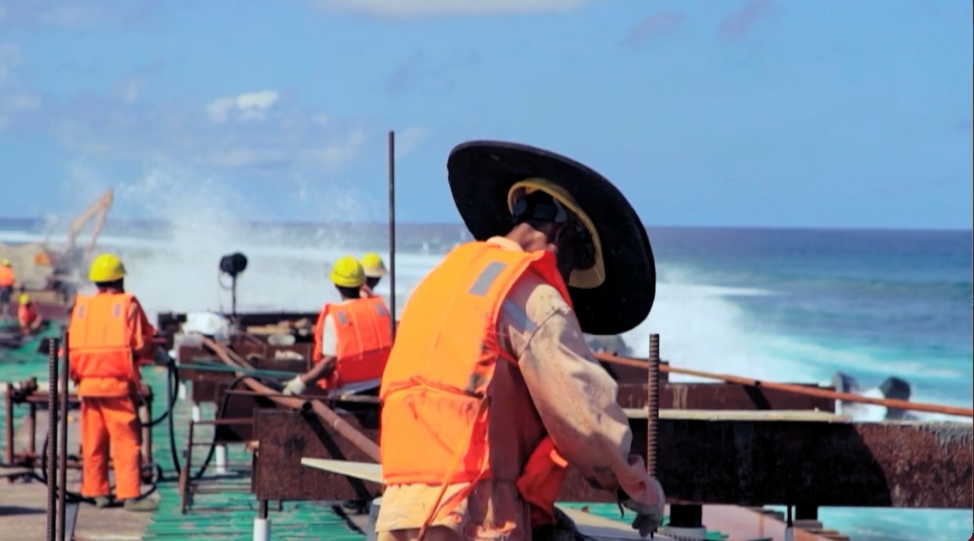 而此時,在兩公里外的嘎杜海峽上,中國建設(shè)者正與驚濤駭浪斗、 與高溫高濕斗、與復(fù)雜地質(zhì)斗……