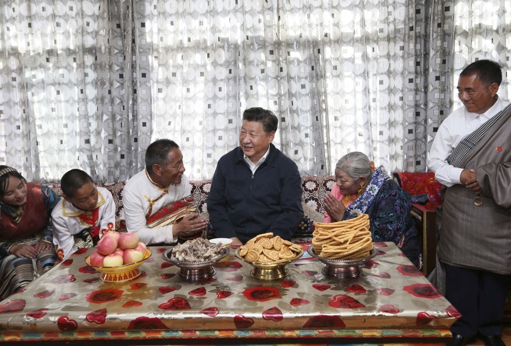 2016年8月22日,習(xí)近平在青海海西蒙古族藏族自治州格爾木市唐古拉山鎮(zhèn)長(zhǎng)江源村藏族村民申格家中同一家人親切交談。