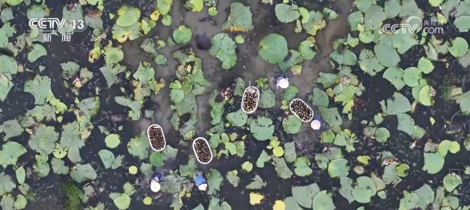 在安徽霍邱縣宋店鎮(zhèn)小路芡實(shí)種植家庭農(nóng)場(chǎng),十幾名工人正在水中采摘芡實(shí)。