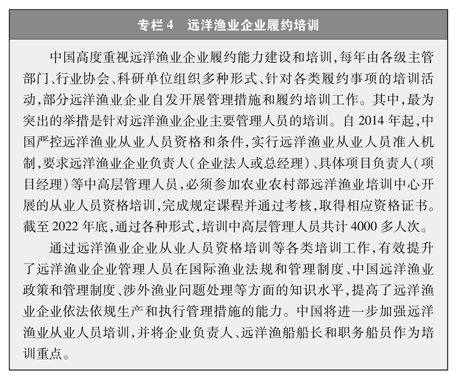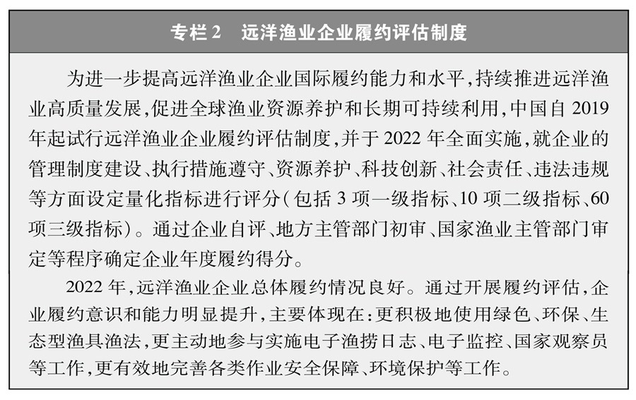 遠(yuǎn)洋漁業(yè)企業(yè)和漁船是履行國際公約、合法合規(guī)從事漁業(yè)生產(chǎn)的主體。2022年中國正式實(shí)施遠(yuǎn)洋漁業(yè)企業(yè)履約評估制度,將企業(yè)履約成績與行政審批、政策支持等掛鉤,通過正向激勵、反向倒逼的方式,引導(dǎo)企業(yè)不斷完善管理制度,嚴(yán)格執(zhí)行管理措施,避免發(fā)生違規(guī)行為,切實(shí)提高履約能力。這一制度有力促進(jìn)了遠(yuǎn)洋漁業(yè)企業(yè)規(guī)范管理和國際履約,得到了各方關(guān)注和廣泛認(rèn)可。