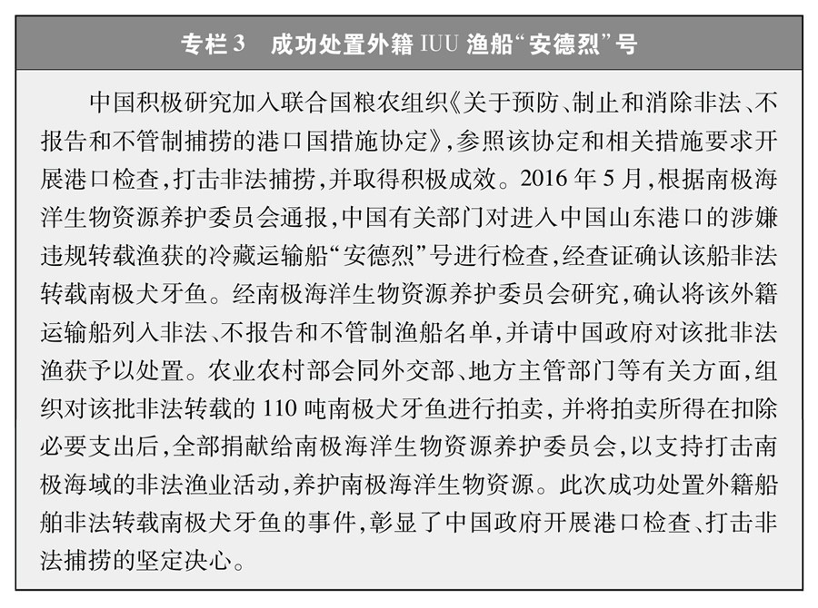 堅(jiān)決支持并積極配合國際社會打擊各種非法漁業(yè)活動。2020年起,中國每年派遣執(zhí)法船赴北太平洋公海開展?jié)O業(yè)執(zhí)法巡航,查處違規(guī)作業(yè)行為。2016年,配合南極海洋生物資源養(yǎng)護(hù)委員會成功扣押處置了一艘外籍漁船非法轉(zhuǎn)載南極犬牙魚案件。2018年起,將中國加入的相關(guān)區(qū)域漁業(yè)管理組織公布的非法、不報(bào)告和不管制漁船名單通報(bào)國內(nèi)各港口,拒絕此類漁船進(jìn)港以及卸貨、補(bǔ)給、加油等活動。