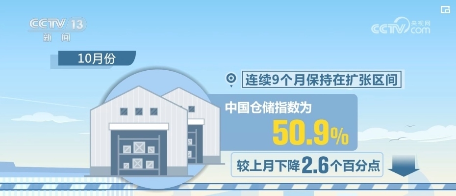 10月份,中國倉儲指數(shù)為50.9%,較上月下降2.6個百分點,連續(xù)9個月保持在擴(kuò)張區(qū)間。