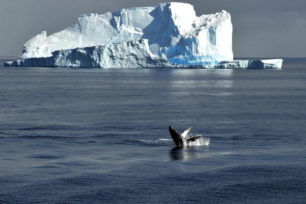 一只鯨魚在羅斯海的一座冰山腳下露出海面。新華社記者 張建松 攝