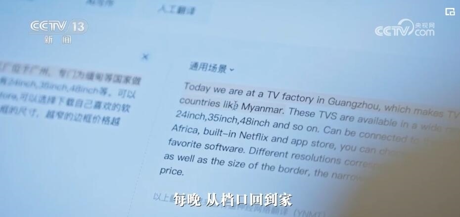方菁:這是我們找的專門做外貿(mào)電視機(jī)的一家(工廠)。我給大家介紹一下,“大家好,我是方菁,今天我們來(lái)到了電視機(jī)工廠”。要介紹得更精密的時(shí)候,我就不知道該怎么說(shuō)了。打開(kāi)我的翻譯軟件,先把我要呈現(xiàn)的字幕輸入進(jìn)去。