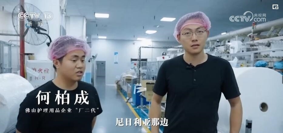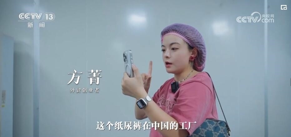 記者:現(xiàn)在方方(方菁)在給她的非洲客戶打視頻電話,來(lái)給她更直觀地看,這個(gè)紙尿褲在中國(guó)的工廠是怎么生產(chǎn)出來(lái)的。