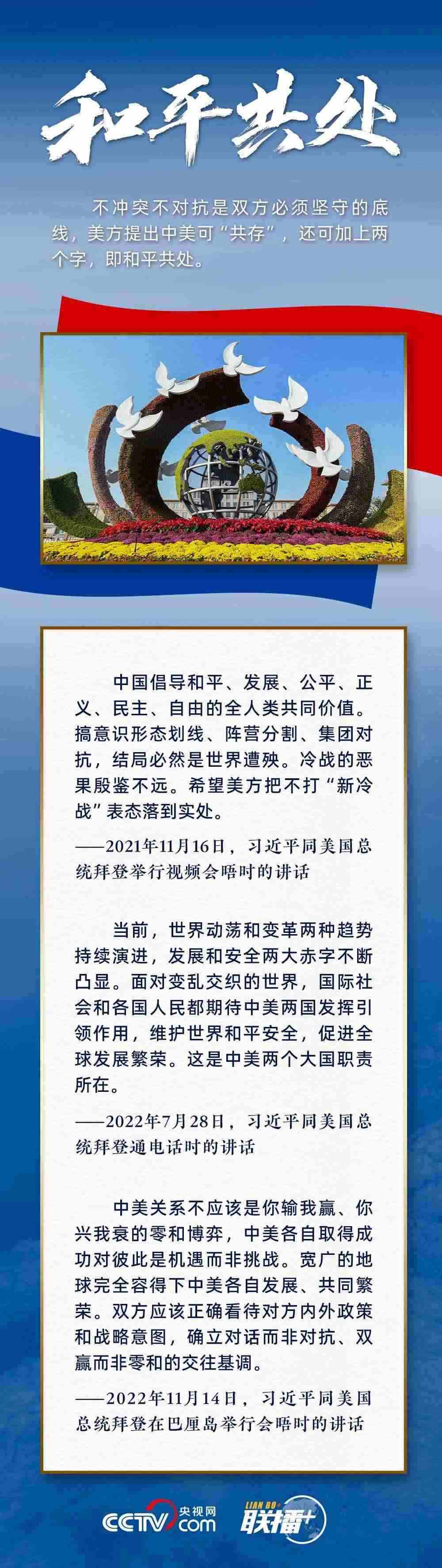“中美不沖突、不對(duì)抗、和平共處,這是兩國最基本的共同利益?!绷?xí)主席指出,遵守國際關(guān)系基本準(zhǔn)則和中美三個(gè)聯(lián)合公報(bào),這是雙方管控矛盾分歧、防止對(duì)抗沖突的關(guān)鍵,也是中美關(guān)系最重要的防護(hù)和安全網(wǎng)。