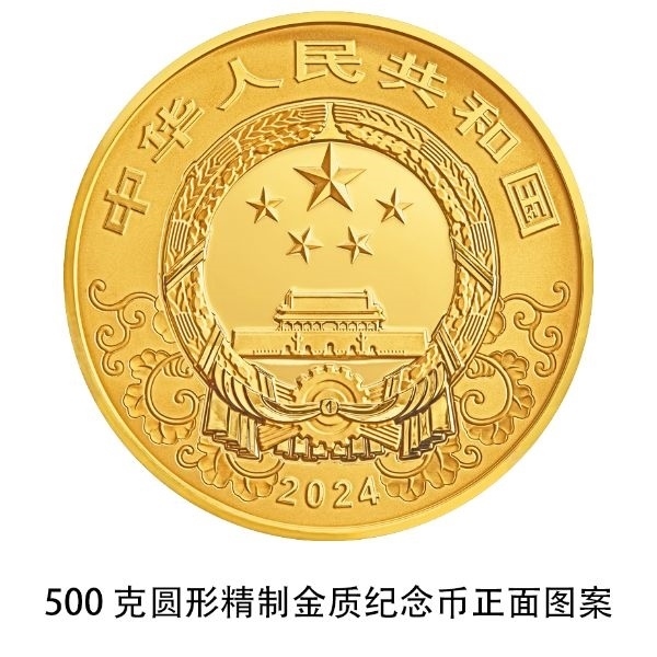500克圓形金質紀念幣為精制幣,含純金500克,直徑80毫米,面額5000元,成色99.9%,最大發(fā)行量500枚。