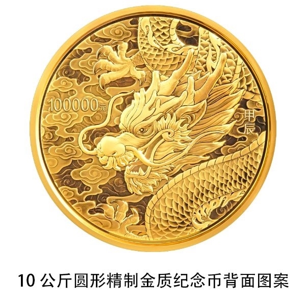 10公斤圓形金質紀念幣背面圖案為龍造型,襯以祥云組合設計。