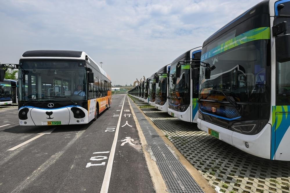 這是負(fù)責(zé)成都第31屆世界大學(xué)生夏季運(yùn)動(dòng)會(huì)交通保障的新能源公交車。新華社記者王曦 攝