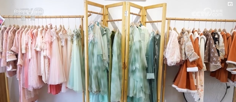 剛開始,這家漢服店只100多套衣服,隨著客流增多,服裝也不停地補充,現(xiàn)在已經有大幾百套的漢服,全店上下每天從早到晚一直都要忙著招待。隨著客人不斷變多,他們所在街上的其他商家也紛紛開起了漢服店。一年之間,這里從曾經的汽修一條街,變成了擁有5000多名從業(yè)者的漢服一條街。