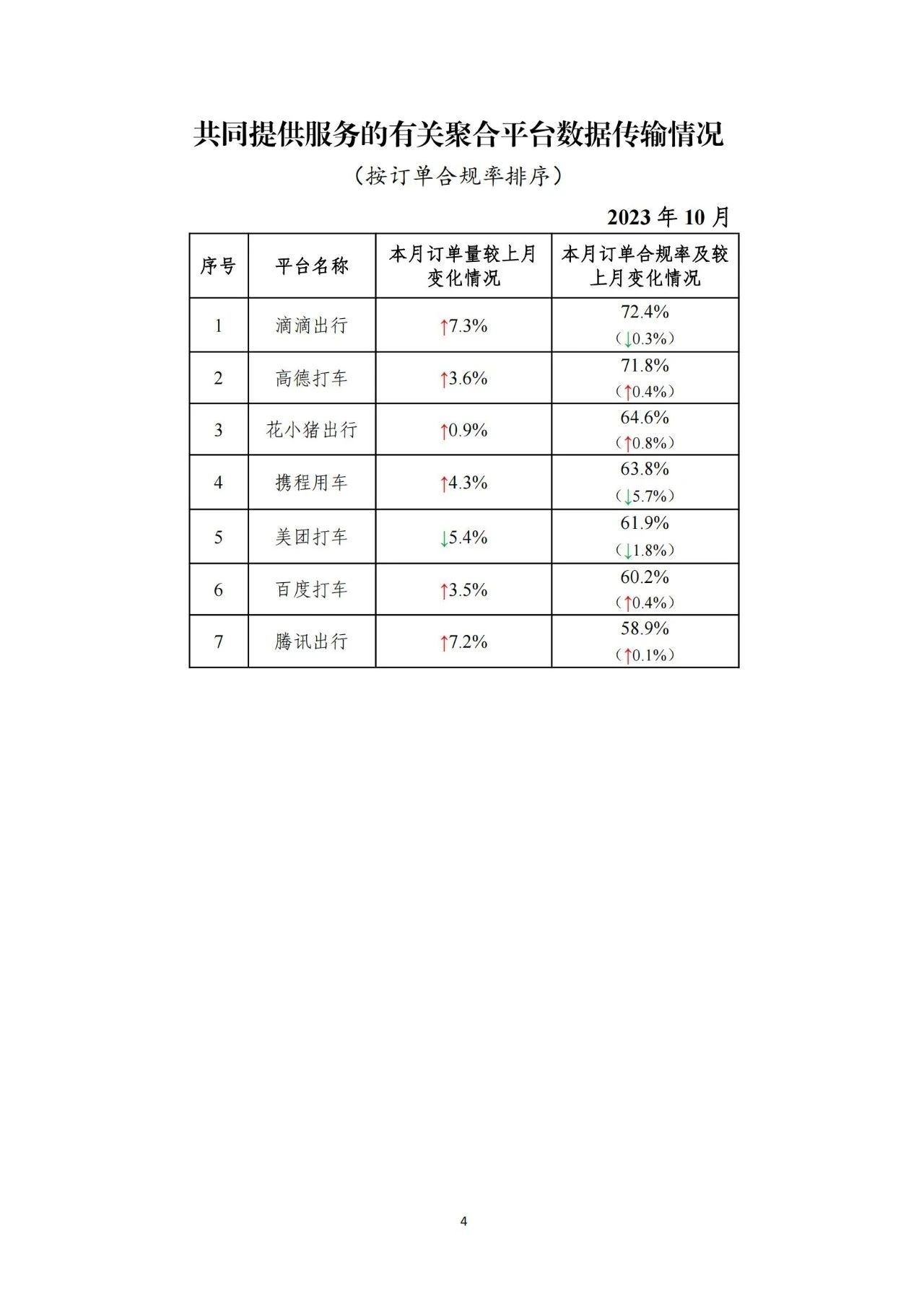 其中,面向乘客、與網(wǎng)約車平臺(tái)公司共同提供服務(wù)的平臺(tái)(俗稱“聚合平臺(tái)”)完成2.23億單,環(huán)比上升3.6%。按訂單合規(guī)率由高到低的分別是滴滴出行、高德打車、花小豬出行、攜程用車、美團(tuán)打車、百度打車、騰訊出行。
