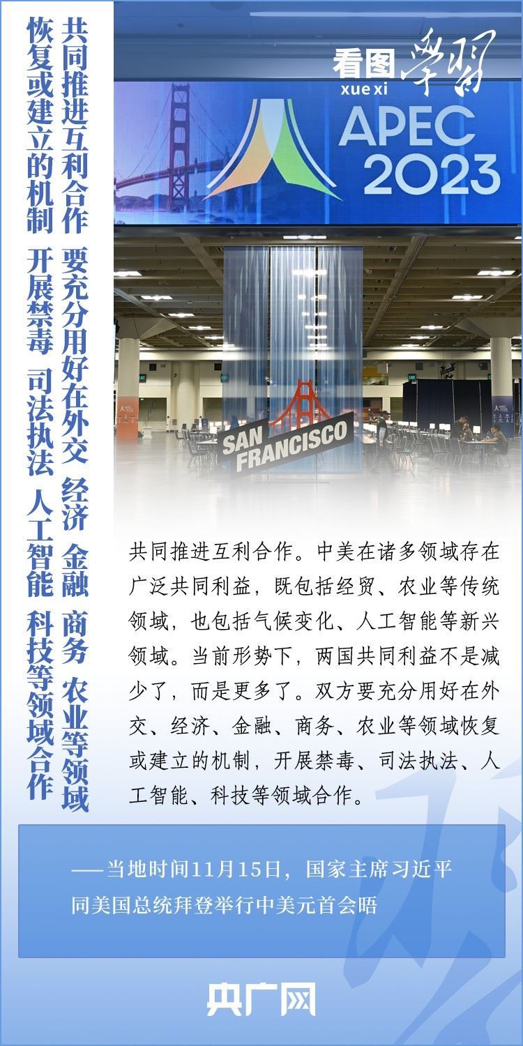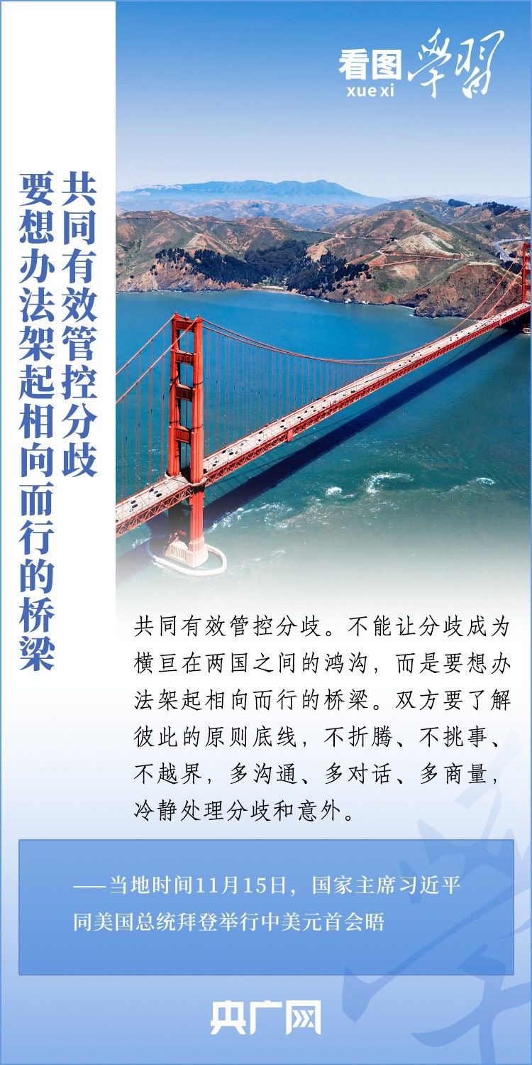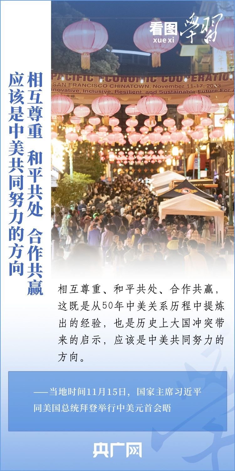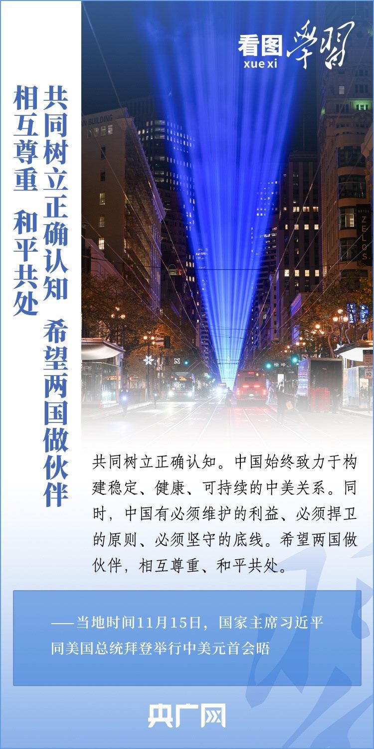 當?shù)貢r間11月15日,國家主席習近平在美國舊金山斐洛里莊園同美國總統(tǒng)拜登舉行中美元首會晤。兩國元首就事關(guān)中美關(guān)系的戰(zhàn)略性、全局性、方向性問題以及事關(guān)世界和平和發(fā)展的重大問題坦誠深入地交換了意見。習近平主席指出,大國競爭解決不了中美兩國和世界面臨的問題。這個地球容得下中美兩國。中美各自的成功是彼此的機遇。一起來學習!