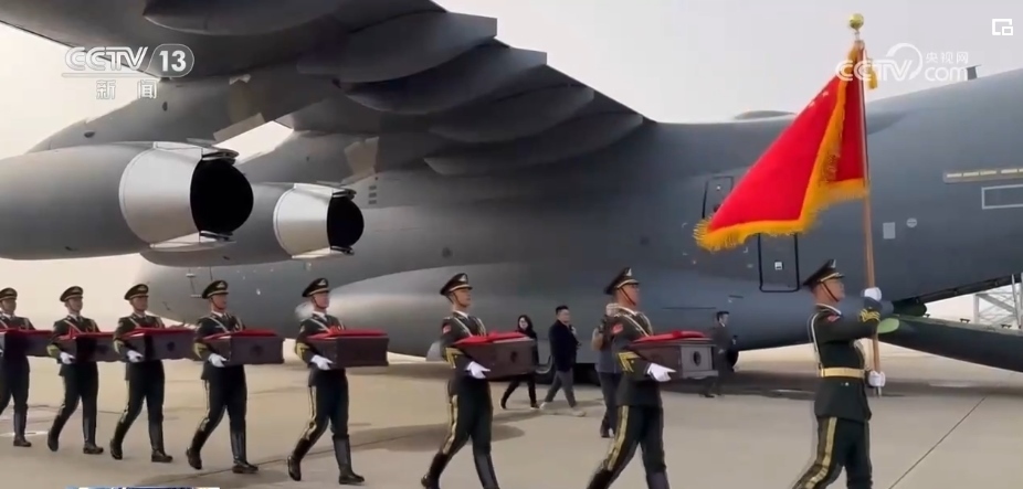隨后,中方禮兵護(hù)送棺槨走上中國空軍運(yùn)-20運(yùn)輸機(jī)。北京時(shí)間11月23日上午,運(yùn)-20運(yùn)輸機(jī)從仁川國際機(jī)場(chǎng)起飛。