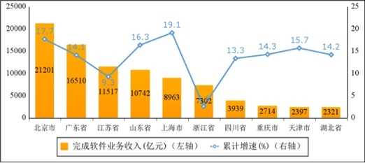 主要軟件大省收入占比持續(xù)提升。1—10月份,軟件業(yè)務(wù)收入居前5名的省份中,北京市、廣東省、江蘇省、山東省、上海市軟件收入分別為21201億元、16510億元、11517億元、10742億元和8963億元,分別增長17.7%、14.1%、9.3%、16.3%和19.1%,五?。ㄊ校┖嫌?jì)軟件業(yè)務(wù)收入68933億元,占全國比重為70.2%,占比較去年同期提高1個(gè)百分點(diǎn)。