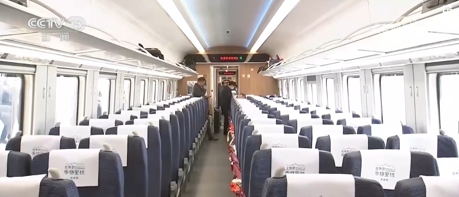總臺記者 劉文杰:這是一款特別針對滇藏鐵路沿線高原、高寒環(huán)境設計的動車組。整列車的涂裝是以“中國紅”為腰帶、以“國槐綠”為窗帶,用“長城灰”進行點綴,整體外觀大氣優(yōu)美。