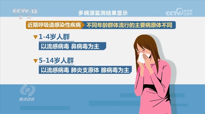 多病源監(jiān)測結(jié)果顯示,近期呼吸道感染性疾病不同年齡群體流行的主要病原體不同。1—4歲人群以流感病毒、鼻病毒為主,5—14歲人群以流感病毒、肺炎支原體、腺病毒為主,15—59歲人群以流感病毒、鼻病毒、新冠病毒為主,60歲及以上人群以流感病毒、人偏肺病毒和普通冠狀病毒為主。