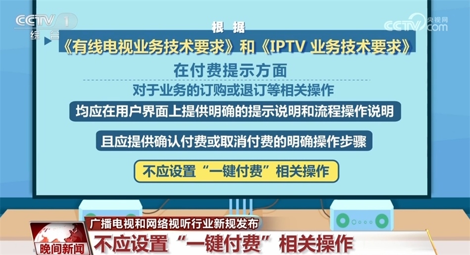 在付費提示方面,對于業(yè)務的訂購或退訂等相關操作,均應在用戶界面上提供明確的提示說明和流程操作說明,且應提供確認付費或取消付費的明確操作步驟,不應設置“一鍵付費”相關操作。此外,有線電視和IPTV遙控器應具備快捷看直播頻道的按鍵,通過此按鍵直接進入全屏直播,按鍵名稱應為“看電視”。