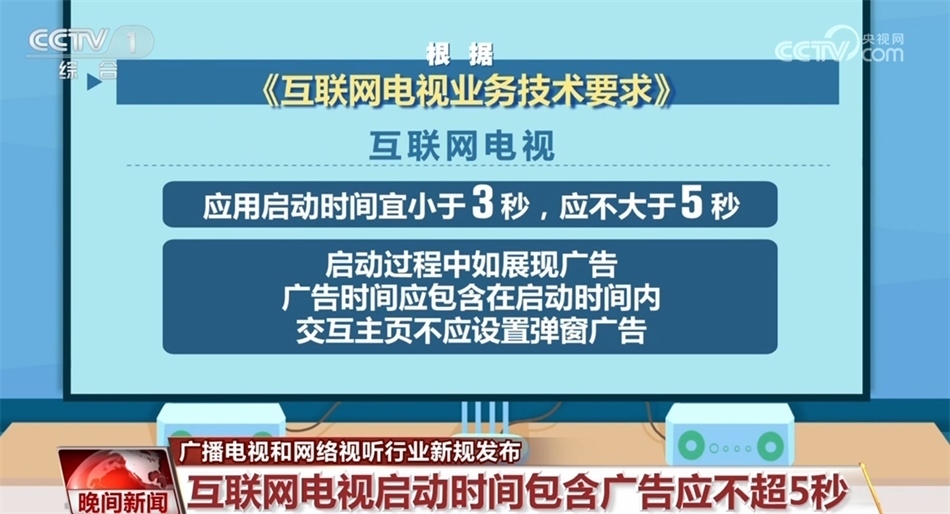 根據(jù)《互聯(lián)網(wǎng)電視業(yè)務技術要求》,互聯(lián)網(wǎng)電視應用啟動時間宜小于3秒,應不大于5秒,啟動過程中如展現(xiàn)廣告,廣告時間應包含在啟動時間內(nèi)。交互主頁不應設置彈窗廣告。交互主頁應設置顯著、便捷的免費業(yè)務專區(qū)入口。在付費提示方面,互聯(lián)網(wǎng)電視對于業(yè)務的訂購或退訂等相關操作不應設置“一鍵付費”,對于任何業(yè)務的定期或連續(xù)扣費,均應在扣費前明確、主動提示用戶。