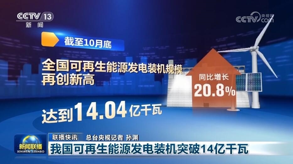 國家能源局發(fā)布數(shù)據(jù)顯示,截至10月底,全國可再生能源發(fā)電裝機(jī)規(guī)模再創(chuàng)新高,達(dá)到14.04億千瓦,同比增長20.8%,約占全國發(fā)電總裝機(jī)的49.9%。