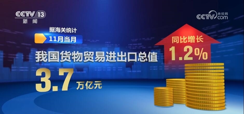 央視網(wǎng)消息:海關總署今天(12月7日)對外公布,今年11月份,我國貨物貿(mào)易進出口總值3.7萬億元,同比增長1.2%。數(shù)據(jù)顯示,我國外貿(mào)穩(wěn)中向好態(tài)勢進一步鞏固。