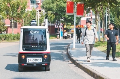 在浙江省金華職業(yè)技術(shù)學(xué)院的校園里,一輛無(wú)人快遞車(chē)在配送快遞。胡肖飛攝(人民圖片)
