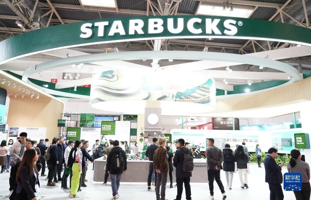 這是在首屆中國國際供應(yīng)鏈促進(jìn)博覽會健康生活鏈展區(qū)拍攝的星巴克展位(2023年11月28日攝)。新華社記者 任超 攝
