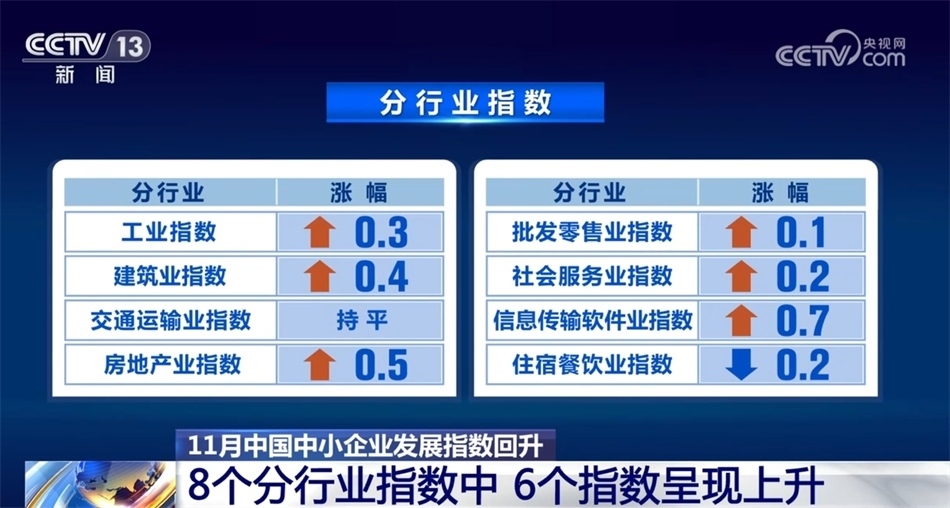 央視網消息:中國中小企業(yè)協(xié)會今天(12月10日)發(fā)布,11月中國中小企業(yè)發(fā)展指數上升0.2點。各分項指數均無下跌,分行業(yè)指數則是6升1平1降。