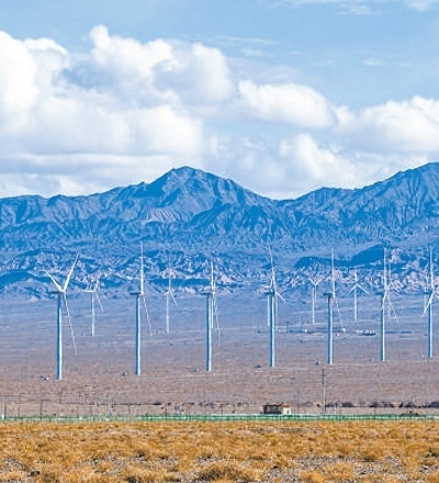 甘肅酒泉玉門市,廣袤戈壁上的風機。