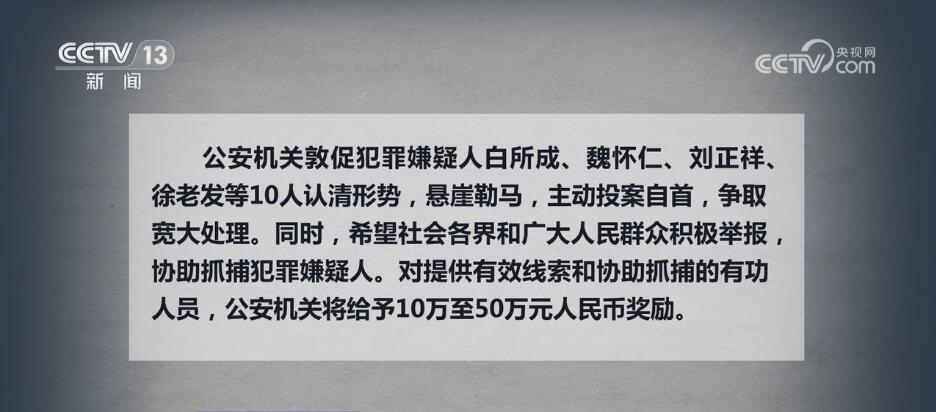 公安機(jī)關(guān)敦促犯罪嫌疑人白所成、魏懷仁、劉正祥、徐老發(fā)等10人認(rèn)清形勢(shì),懸崖勒馬,主動(dòng)投案自首,爭(zhēng)取寬大處理。同時(shí),希望社會(huì)各界和廣大人民群眾積極舉報(bào),協(xié)助抓捕犯罪嫌疑人。對(duì)提供有效線索和協(xié)助抓捕的有功人員,公安機(jī)關(guān)將給予10萬至50萬元人民幣獎(jiǎng)勵(lì)。
