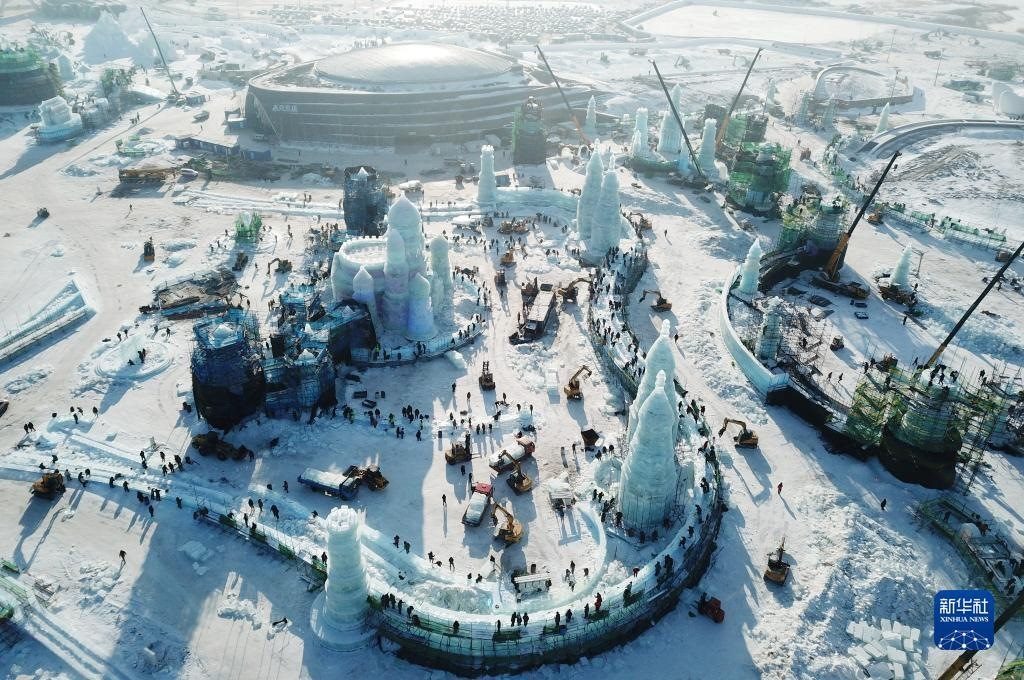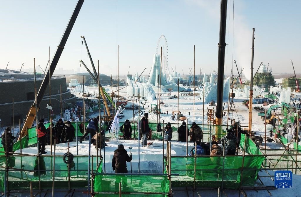 12月12日,在黑龍江省哈爾濱市冰雪大世界建設(shè)現(xiàn)場(chǎng),工人在零下20多攝氏度的低溫下施工作業(yè)(無(wú)人機(jī)照片)。
