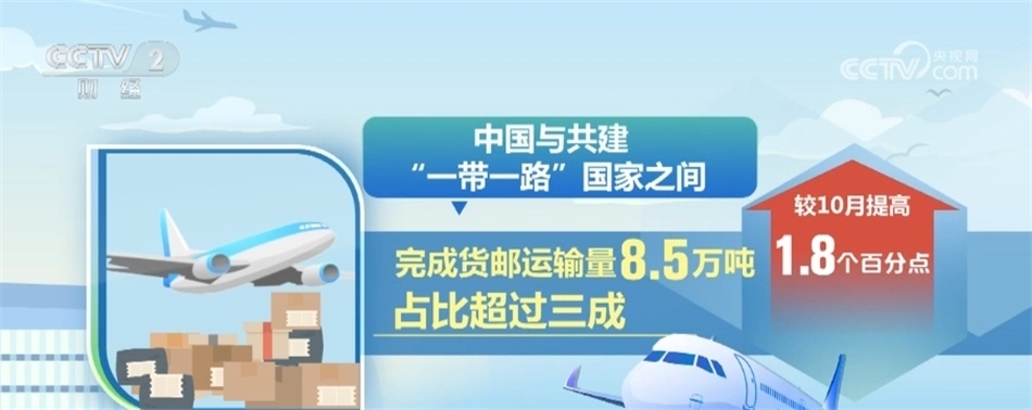 國際航線中,我國航空公司在中國至歐洲航線完成貨郵運(yùn)輸量最大,達(dá)10.9萬噸,占比近四成;中國至亞洲其他國家航線貨運(yùn)恢復(fù)水平最高;中國至北美航線貨運(yùn)繼續(xù)恢復(fù),完成6.2萬噸;中國與共建“一帶一路”國家之間完成貨郵運(yùn)輸量8.5萬噸,占比超過三成,較10月提高1.8個(gè)百分點(diǎn)。