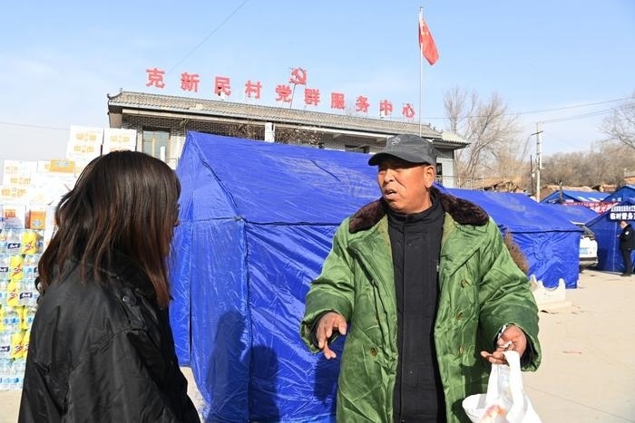 2023年12月22日,在積石山縣大河家鎮(zhèn)克新民村安置點(diǎn),黨支部書記張輝林(右)給工作人員囑咐物資分發(fā)事項(xiàng)。新華社記者 范培珅 攝