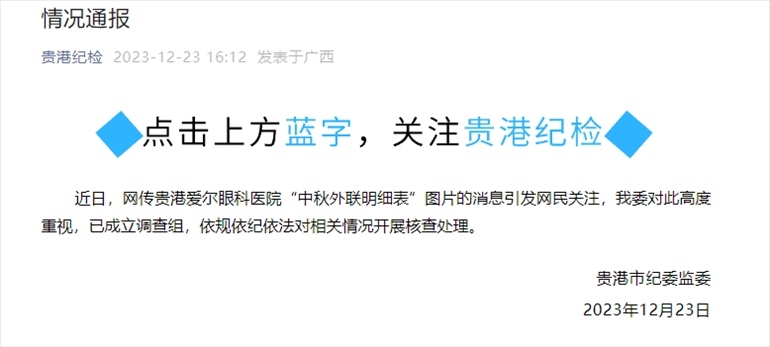 ·貴港市紀(jì)委通報(bào)“網(wǎng)傳愛爾眼科中秋外聯(lián)明細(xì)表”:已成立調(diào)查組,對相關(guān)情況開展核查處理。據(jù)早前報(bào)道,網(wǎng)友爆料發(fā)布了兩張標(biāo)為“中秋外聯(lián)明細(xì)表”的圖片,其中涉及42名公職人員以及59000元額度的購物卡,并在評論中透露上述圖片的涉事單位為貴港愛爾眼科醫(yī)院。