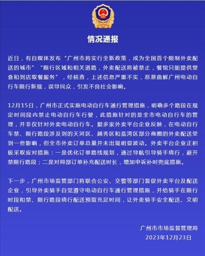 ·網(wǎng)傳廣州限制外賣配送?廣州市市場監(jiān)督管理局:嚴(yán)重不實(shí)。