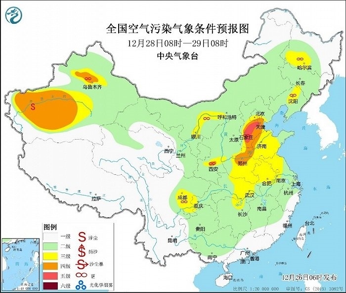 冷空氣勢力弱,霧和霾天氣又要登場。今天,華北、黃淮等地有輕度霾,局地中度或重度霾,27日華北中南部大氣擴(kuò)散條件將有所改善。28日至30日,華北中南部、黃淮中西部、汾渭平原等地大氣擴(kuò)散條件再次轉(zhuǎn)差,將有輕至中度霾,部分地區(qū)重度霾。此外,28日至30日的夜間至上午時段,華北中南部、黃淮、江淮東部、江漢、四川盆地等地的部分地區(qū)有大霧,局地有能見度不足200米的強(qiáng)濃霧。