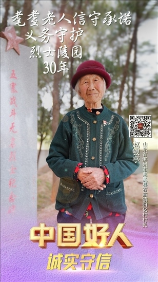 趙銀亭,女,1929年10月生,中共黨員,山東省濱州市惠民縣石廟鎮(zhèn)歸化村村民。趙銀亭是一位有75年黨齡的老黨員。1992年,當(dāng)?shù)亟⒘沂苛陥@,需要一位守陵人,63歲的趙銀亭主動(dòng)報(bào)了名。自此,她與丈夫搬到了距烈士陵園不過15米的舊屋居住。30多年來,她堅(jiān)守信仰,守護(hù)烈士陵園,為前來參觀的人員講述英烈故事。