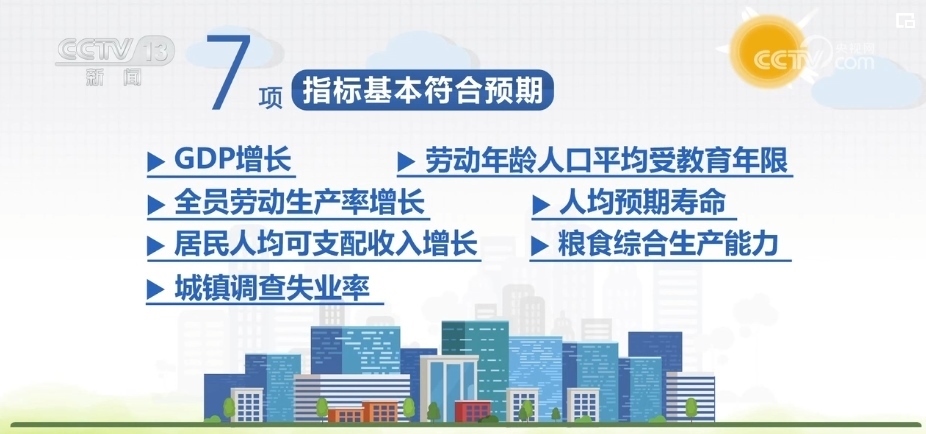 7項(xiàng)指標(biāo)基本符合預(yù)期,分別是GDP增長、全員勞動(dòng)生產(chǎn)率增長、居民人均可支配收入增長、城鎮(zhèn)調(diào)查失業(yè)率、勞動(dòng)年齡人口平均受教育年限、人均預(yù)期壽命、糧食綜合生產(chǎn)能力。