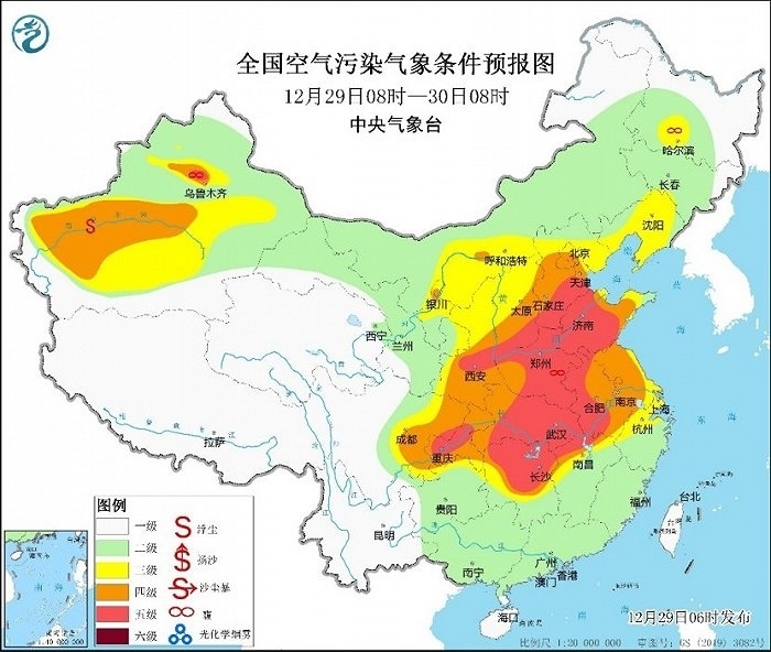 今天至30日白天,將是本次霧和霾天氣過程影響最重的時(shí)段,預(yù)計(jì)華北中南部、黃淮中西部、汾渭平原、江漢、四川盆地等地將有輕至中度霾,其中,天津、河北中南部、山東西部、河南北部等地有重度霾。29日夜間至30日的早晨至上午時(shí)段,華北中南部、黃淮、江淮等地的部分地區(qū)仍有大霧天氣,今天18時(shí)將繼續(xù)發(fā)布大霧預(yù)警。