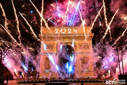 當(dāng)?shù)貢r(shí)間2024年1月1日,法國(guó)巴黎舉行新年慶?;顒?dòng),凱旋門(mén)前燃放煙花。