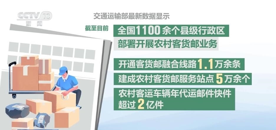 交通運(yùn)輸部發(fā)布數(shù)據(jù)顯示,全國(guó)1100余個(gè)縣級(jí)行政區(qū)部署開(kāi)展了農(nóng)村客貨郵業(yè)務(wù),農(nóng)村客運(yùn)車輛年代運(yùn)郵件快件超過(guò)2億件。
