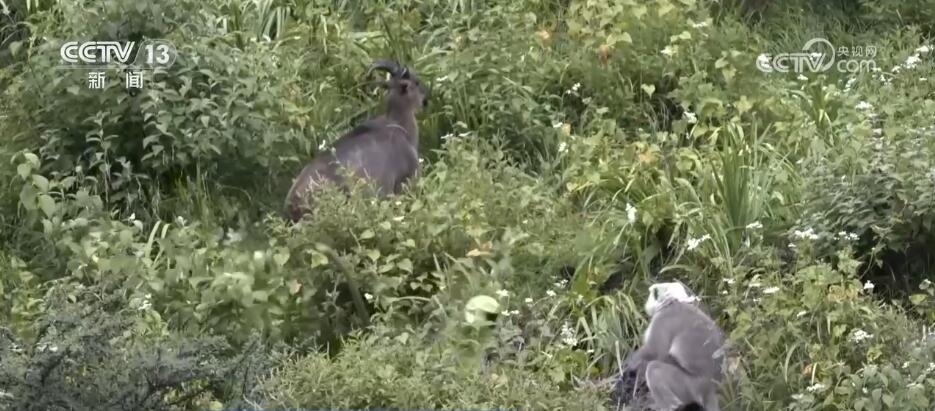 突然,林間騷動(dòng)起來(lái),幾只長(zhǎng)尾葉猴從天而降來(lái)到塔爾羊中間,這是首次記錄到這兩個(gè)物種群體同框覓食的珍貴畫面。對(duì)它們而言,聚在一起可以加強(qiáng)警戒,更容易發(fā)現(xiàn)天敵。