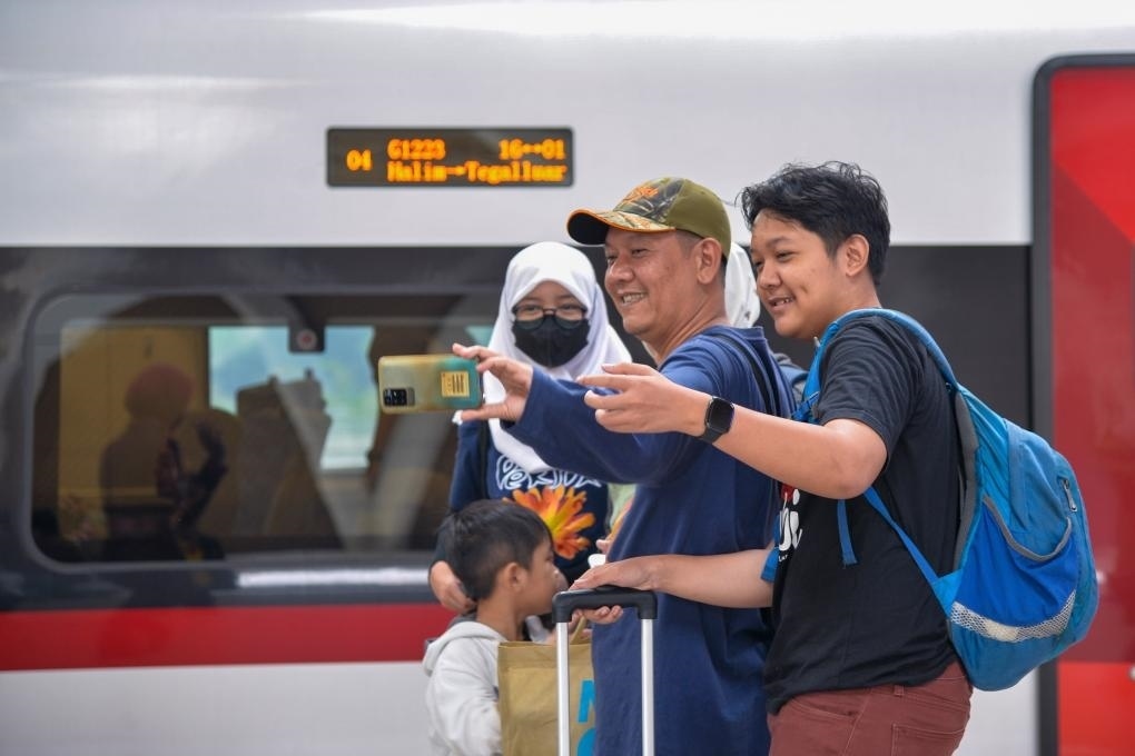 2023年12月25日,乘客在印度尼西亞雅加達(dá)的哈利姆車站站臺(tái)與雅萬(wàn)高鐵高速動(dòng)車組合影。截至12月24日,作為中印尼共建“一帶一路”合作的“金字招牌”,雅萬(wàn)高鐵累計(jì)發(fā)送旅客突破100萬(wàn)人次。