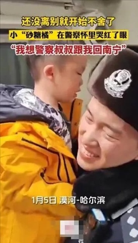 1月5日,從漠河回哈爾濱的雪國列車上,有位“砂糖橘殿下”邊哭邊抱著警察叔叔不撒手,“我想警察叔叔跟我回南寧?!眮碜詵|北警察叔叔的愛,一定是最最暖的吧!