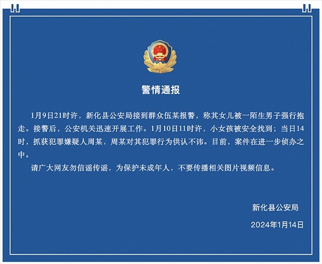 ·網(wǎng)傳湖南一女童在樓道被男子強(qiáng)行抱走?警方通報(bào):犯罪嫌疑人已被抓獲。