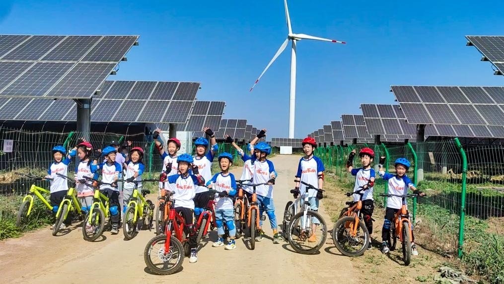 圖為研學(xué)團(tuán)的小朋友們騎行參觀小王莊鎮(zhèn)光伏電站。新華社發(fā)(李暢攝)
