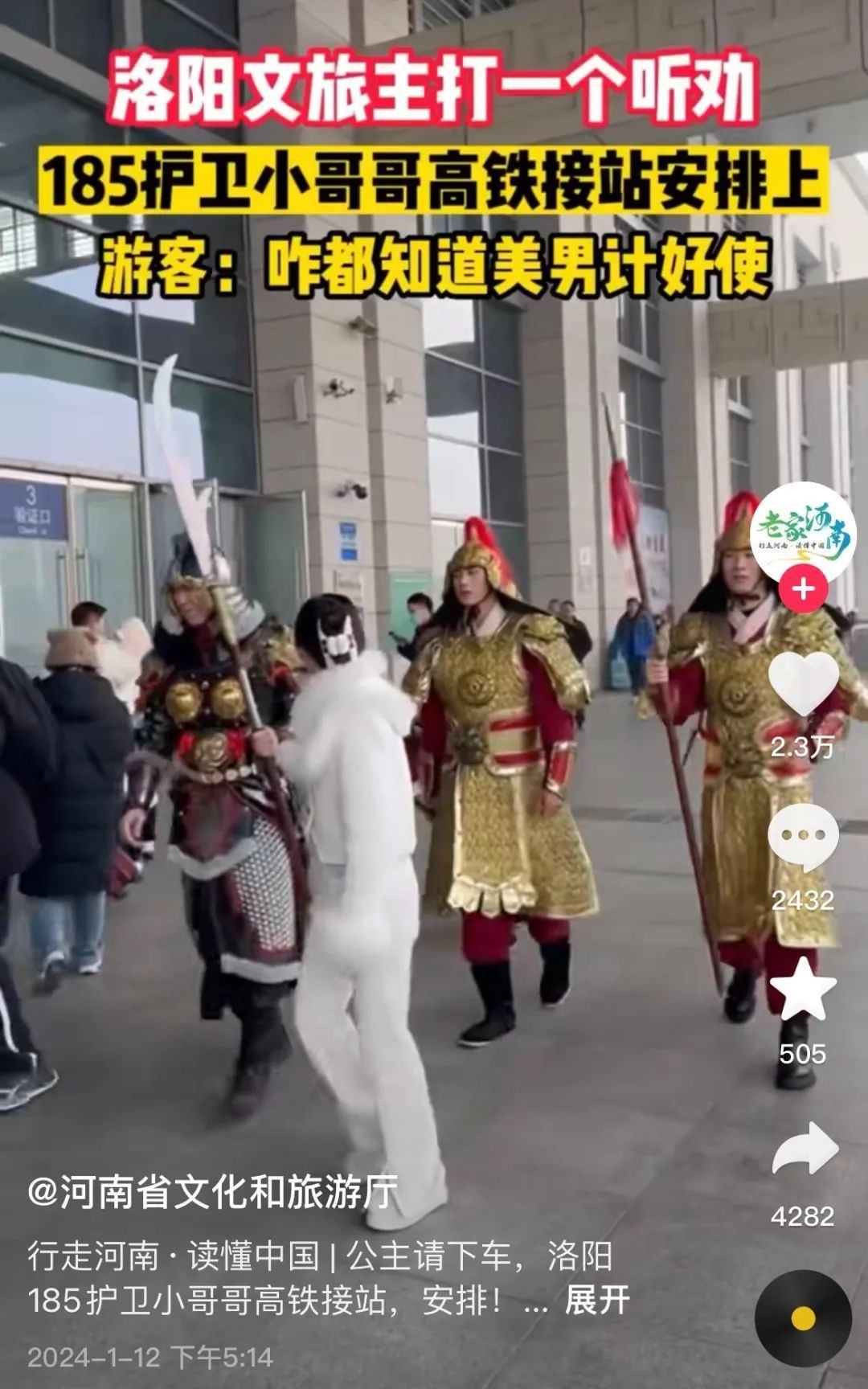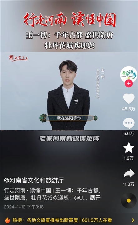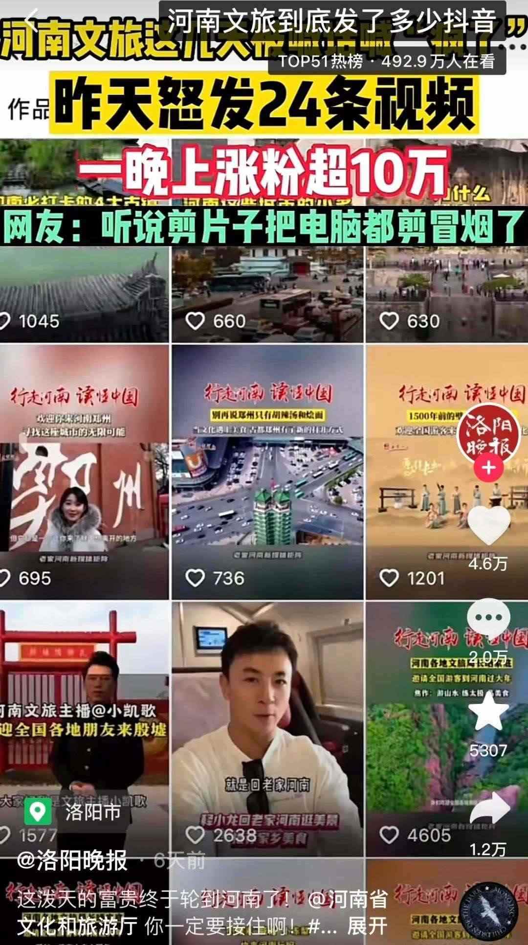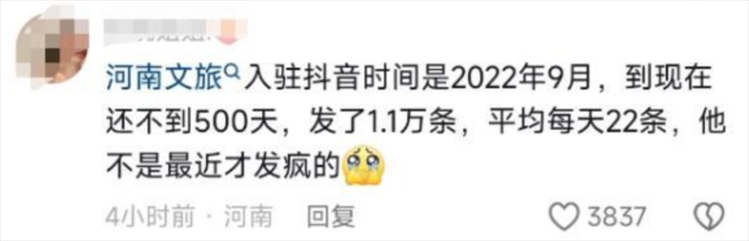 有人統(tǒng)計,自1月9日起,河南文旅官方賬號“河南省文化和旅游廳”每天發(fā)布二三十條視頻,連續(xù)四天發(fā)布了112條視頻,持續(xù)展示本地文旅資源,吸引了近百萬新粉絲,主打一個“量變總會引起質(zhì)變”,以至于“河南文旅到底發(fā)了多少抖音”相關(guān)話題成為熱門搜索。