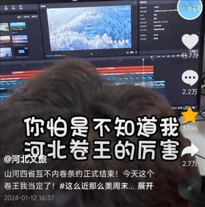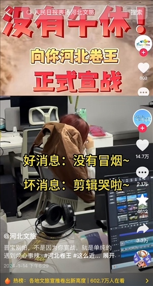 有網(wǎng)友建議賬號改名為“河北文旅”,“不然都搜不到”,“聽勸”的官方賬號火速改名,并發(fā)布視頻“宣戰(zhàn)”,“山河四省互不內(nèi)卷條約正式結(jié)束,今天這個卷王我當(dāng)定了”,于是開始“瘋狂輸出”,日更75條,可還了得?