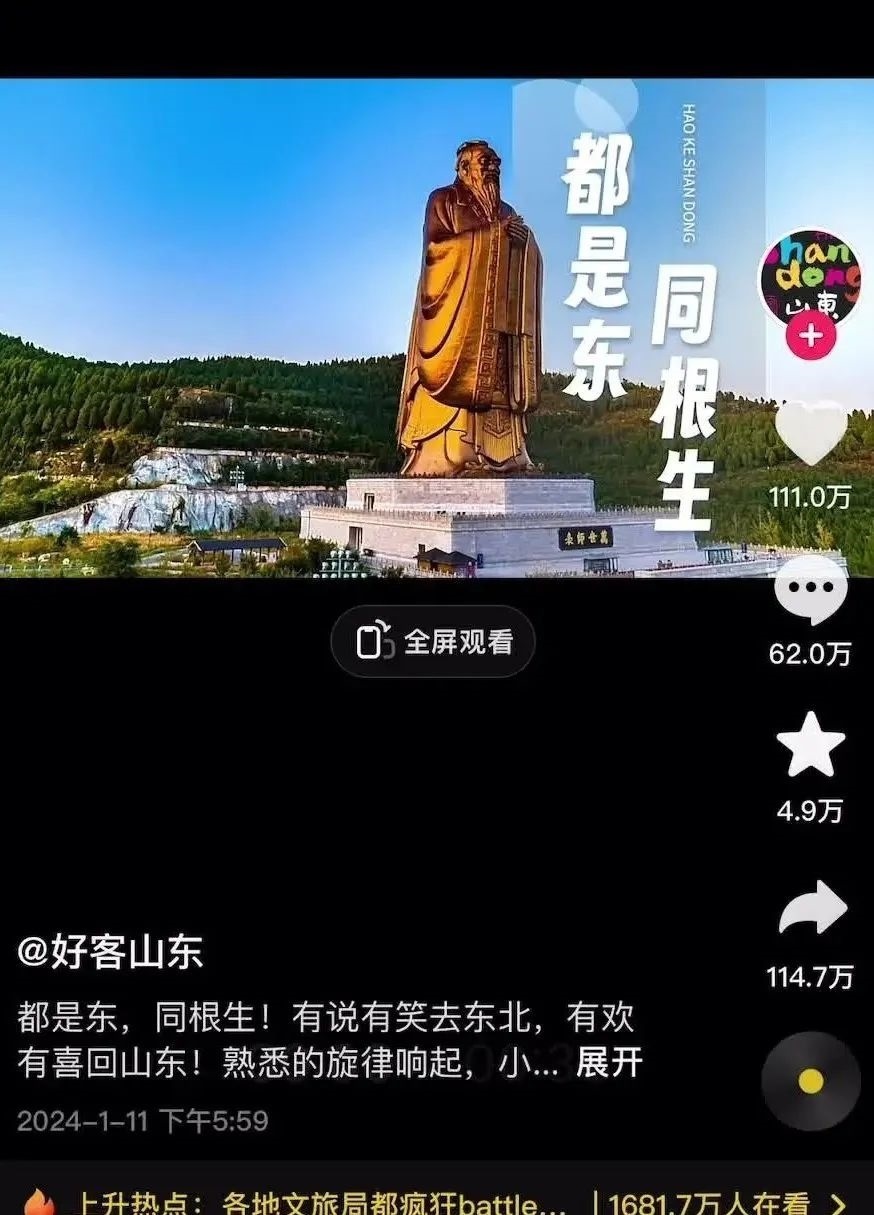有說有笑去東北,有歡有喜回山東……”山東文旅呢,用一條“我姓東”的土味視頻把自己送上了熱搜,目前超111萬網(wǎng)友點贊。